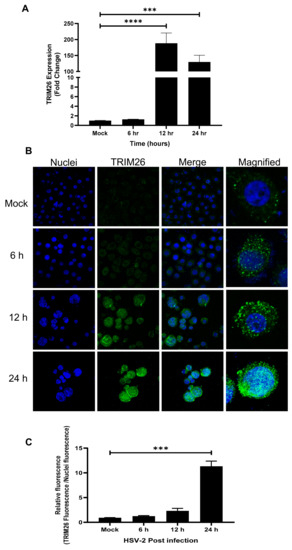 We first determined a time course for TRIM26 mRNA and protein expression in VK2 WT cells following HSV-2 infection. The VK2 cell line was chosen because it is an immortalized cell line from normal vaginal epithelial cells that can be genetically altered, passaged and grown easily in multilayers similar to squamous epithelium of the vaginal tissue allowing ALI culture, as described [21]. VK2 cells were grown in ALI cultures for 7 days and then infected with HSV-2 (strain 333) at an MOI of 1. RNA was extracted at 6, 12 and 24 h post HSV-2 infection for subsequent quantitative RT-qPCR to measure TRIM26 gene expression, compared to uninfected control cells. We found that HSV-2 infection upregulated TRIM26 gene expression 200-fold after 12 h of infection and 150-fold after 24 h post infection, as compared to mock controls (Figure 1A). In addition, we performed immunofluorescence staining for expression of the TRIM26 protein at the same time points. It was found that protein levels of TRIM26 increased significantly at 12 and 24 h post infection (Figure 1B,C). Interestingly, TRIM26 was found in the nucleus of HSV-2-infected VK2s but not in the mock control as seen in magnified images (Figure 1B). This suggests that infection with HSV-2 promotes accumulation of TRIM26 protein in the nucleus between 6 and 24 h after HSV-2 infection. This validates the previously reported effect of viral infection that promoted TRIM26 localization to the nucleus [18]. These observations indicate that HSV-2 infection upregulates TRIM26 mRNA and protein and promotes its localization to the nucleus in vaginal epithelial cells.