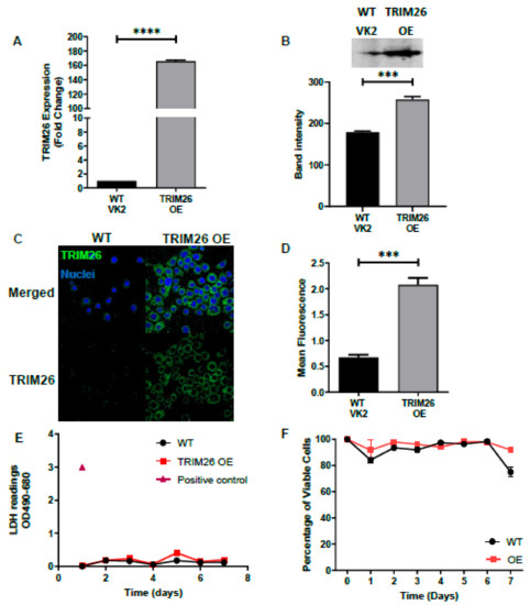Validation of TRIM26 over expression (OE) cell line. TRIM26 OE cell line was validated by comparison to wild type (WT)VK2 cell line for TRIM26 mRNA and protein expression levels. (A) TRIM26 gene expression in WT VK2 and TRIM26 OE cell lines were analyzed by RT qPCR as fold change relative to uninfected WT controls. Results show mean ± SEM fold change (n = 4); Statistical significance: **** p < 0.0001. (B) TRIM26 protein expression analyzed in WT and TRIM26 OE cell lysates by Western blot. Band intensity was measured by ImageJ software for n = 3 samples; statistical significance: *** p < 0.001 (C) Representative fluorescent images (n = 5) with immunofluorescence staining of TRIM26 (green) and nuclear DNA stain (blue) for WT VK2 and TRIM26 OE, by confocal microscopy. Magnification x630. (D) Fluorescence of TRIM26 protein from immunofluorescent images was measured by Image J software and mean + SEM calculated (n = 5). Statistical significance: *** p < 0.001. Supernatant collected from cell lines was used for lactate dehydrogenase (LDH) assay (E) and to quantify percent viable cells by Trypan blue dye exclusion test (F) comparing WT VK2 with TRIM26 OE cells during 7 days of culture. Positive control total cell LDH shown in (E). Data are mean ± SEM for (n = 3) replicate cultures for both (E) and (F).