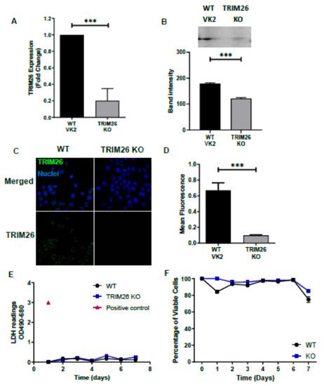 Since TRIM proteins are known to play a role in antiviral host defense [27], and TRIM26 is known to be highly transcribed in human vaginal tissue [19,20], we hypothesized that TRIM26 plays a role in HSV-2 infection. To test our hypothesis, we first generated two transgenic cell lines from WT VK2 cells, one with overexpression (TRIM26 OE) of TRIM26 and the second with knocked out TRIM26 (TRIM26 KO), as described in materials and methods. Confocal immunofluorescence microscopy and RT-qPCR analysis were used to validate the altered expression of TRIM26 in transgenic TRIM26 OE and TRIM26 KO cell lines. The results indicated that TRIM26 mRNA (measured by qPCR) and protein (measured by immunofluorescence and Western blot) are highly expressed in TRIM26 OE cells compared to WT VK2 cells (Figure 2A–D). In addition, overexpression of TRIM26 in VK2 cells had no effect on cell growth and no measurable change in viability, nor indication of metabolic stress when compared to WT VK2, as assessed by viable cell counts and LDH release assays over 7 days of culture (Figure 2E,F). The TRIM26 KO cells demonstrated nearly absent TRIM26 mRNA and intracellular TRIM26 protein compared to WT VK2 cells (Figure 3A–D). Knocking out TRIM26 in VK2 cells had no effect on cell growth or viability and did not show any increase in LDH release, as compared to WT VK2 cells over 7 days of culture (Figure 3E,F).