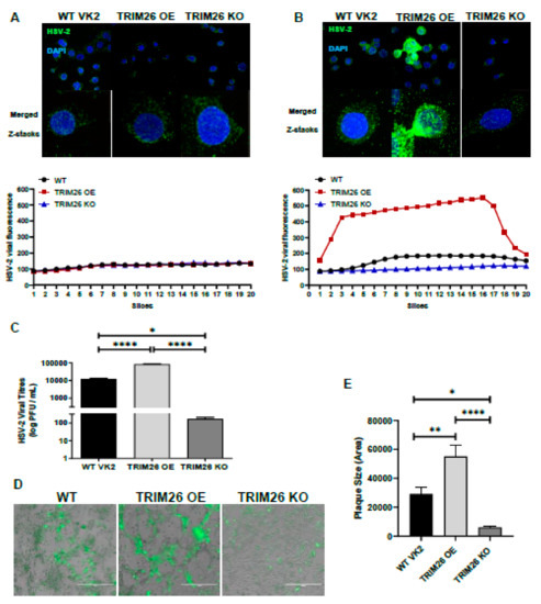 Plaque size measurements were performed in 60–70% confluent monolayers of WT VK2, TRIM26 OE, TRIM26 KO cells in 24-well plates. Cells were then infected with HSV-2 strain 333 tagged with green fluorescent protein (GFP) for 2 h to allow virus adsorption. After 2 h, cells were washed three times with PBS to remove unbound viral particles and then overlaid with DMEM/F12 medium supplemented with 10% fetal bovine serum and 0.05% human immune serum incubated for 48 h at 37 °C. After incubation, the cells were fixed and viral plaques were quantified and imaged using a fluorescence microscope: EVOS™ FL digital inverted fluorescence microscope (Thermo Fisher, Waltham, MA, USA) at a ×40 magnification, and plaque size was measured using ImageJ software.