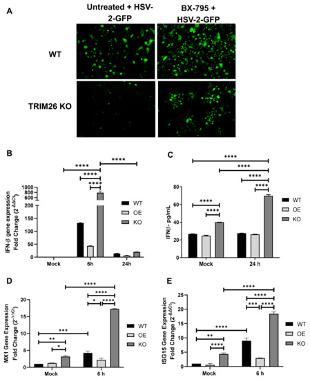 To confirm that HSV-2 infection is controlled through the IRF3 signaling pathway under the influence of TRIM26, WT VK2 and TRIM26 KO cell lines were treated with BX-795, an inhibitor of TBK1 and IKKɛ which are upstream of IRF3 signaling [30]. Cells were treated with BX-795 for an hour after which the inhibitor was removed and cells were subsequently infected with HSV-2-GFP (MOI = 1) (Figure 6A). Both WT VK2 and TRIM26 KO cell lines showed significant increase in HSV-2 GFP infection after BX-795 treatment, a result that confirms that inhibition of the IRF3 pathways contributes to increased HSV-2 infection.