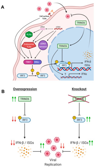 - Wang, P.; Zhao, W.; Zhao, K.; Zhang, L.; Gao, C. TRIM26 negatively regulates interferon-beta production and antiviral response through polyubiquitination and degradation of nuclear IRF3. PLoS Pathog. 2015, 11, e1004726. [Google Scholar] [CrossRef] [PubMed]