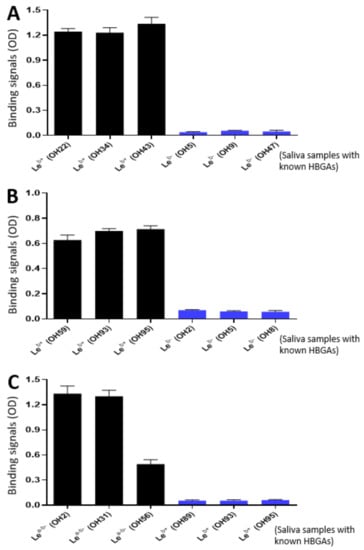As the glycan receptor binding domains of rotaviruses, VP8*s are known to recognize specific glycan ligands. Specifically, P[8] and P[4] VP8*s bind Leb antigens [22,42]. Using the saliva bank of our lab consisting of 96 well-phenotyped saliva samples and the established glycan binding methods [22,46], we found that the purified P24-VP8* P[8] and P24-VP8* P[4] nanoparticles bound Leb positive, but not Leb negative saliva samples (Figure 4A,B). We also screened the binding of the P24-VP8* P[6] nanoparticle to our 96 well-characterized saliva samples and found that it bound Lea-b- saliva samples (Figure 4C). However, it remains unknown at this time what specific glycans in these saliva samples were responsible for the observed P24-VP8* P[6] nanoparticle-binding signals. These data strongly suggested that the VP8* antigens on the P24-VP8* nanoparticles retain their authentic structure and conformations, supporting the notion that the P24-VP8* nanoparticles are suitable to be rotavirus vaccine candidates.