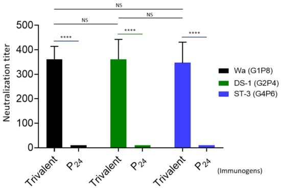 Neutralization of the P24-VP8* nanoparticle trivalent vaccine-immunized mouse sera against three homologous rotavirus P types. The 50% neutralization titers (Y-axis) of mouse sera after administration with the trivalent vaccine (trivalent) against a P[8] (Wa strain, G1P8, black columns), a P[4] (DS-1 strain, G2P[4], green columns), and a P[6] (ST-3, G4P6, blue columns) rotavirus in cell culture are shown and compared each other using the mouse sera after immunization with the P24 nanoparticles without the VP8* antigens (P24) as controls (X-axis). Statistical differences between data groups are indicated as “ns” for non-significant for p-values > 0.05, and **** for extremely significant for p-values < 0.0001.