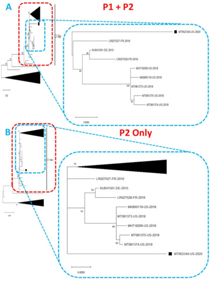 Phylogenetic tree of genetic relationship between (A) P1 + P2 and (B) P2 only nucleotide sequences of EV-A71 genotype C1. The phylogenetic trees are based on an alignment of nucleotide sequences of the respective genomic regions. The newly sequenced variant (MT952340, detected in wastewater in Arizona 2020) is indicated with a black square. Bootstrap values are indicated if >50%.