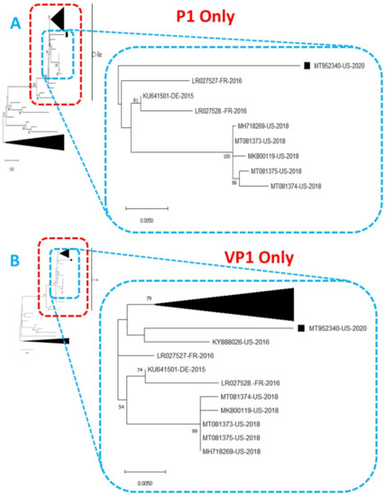 Phylogenetic tree of genetic relationship between (A) P1 only and (B) VP1 only nucleotide sequences of EV-A71 genotype C1. The phylogenetic trees are based on an alignment of nucleotide sequences of the respective genomic regions. The newly sequenced virus (MT952340, detected in wastewater in Arizona 2020) is indicated with a black square. Bootstrap values are indicated if >50%.