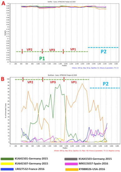 Phylogentic analysis of the P1 and P2 regions from MT952340 suggests that it shares a common ancestor with the lineage that contains C1-like variants associated with severe neurological complications in Europe (from 2015–2016) and America (2018) (Figure 1 and Figure 2A). However, we found contrary results when examining VP1. Phylogenetic analysis using the complete gene suggests MT952340 is most closely related to a 2016 variant (KY888026) recovered in the USA (Figure 2B). This could be due to selection bias since most of the eighty (80) sequences analyzed here have a complete genome (or at least complete P1) but most sequences in GenBank have only VP1. Specifically, we searched GenBank using the query “Enterovirus A71 complete genome” or “Enterovirus A71 VP1” and found 1001 and 10,622 hits, respectively. To rule out this bias, we used the complete VP1 sequence of our variant (MT952340) in a BLASTn search of GenBank and selected the top 100 hits. We removed 39 sequences that were already in our dataset and used the 61 remaining, plus our dataset of 80 sequences, to construct a new ML tree. The result (Figure S1) shows a similar topology as Figure 2B with MT952340 clustering with the 2016 variant (KY888026) recovered in the USA. These results, taken together, suggest that MT952340 has recombination occurring within the P1 genomic region. To further examine this hypothesis, we performed similarity and bootscan analysis in Simplot [11]. Simplot showed that MT952340 was indeed a C1-like EVA71 both in the P1 and P2 genomic regions (Figure 3A). Bootscan analysis however suggest that MT952340 might have a complex recombination history even within the C1-like sub-genogroup (Figure 3B). Specifically, it suggested that P1 was (at least) a double recombinant. We tested this hypothesis by making ML trees of VP1, VP2 and VP3 and these confirmed the results of bootscanning by showing different topologies per gene (Figures S2–S4). In addition, pairwise distance analysis using complete VP1 sequences showed that all the EVA71 variants in GenBank were >2% divergent from MT952340 (data not shown). In poliovirus surveillance parlance, this would have been classified an ‘orphan virus’ [12], suggesting gaps in case-based surveillance. Going by the molecular clock of EVs [13,14], the fact that all the EVA71 variants in GenBank were >2% divergent from MT952340 suggests that a predecessor variant circulated and consequently accumulated mutations for over two years to result in the sequence MT952340 (the variant described here). More importantly, none of the variant sequences spanning the over two-year evolution from the predecessor variant to MT952340 have been made publicly available, if sequenced. Hence, as of the time of writing, analysis of MT952340 using publicly available sequence data in GenBank shows that there is a two-year gap of undescribed circulation of EVA71 C1-like variants related to MT952340. Whether these strains have been detected by different research groups, but are yet to be deposited in public databases such as GenBank, remains to be determined. This could be long enough to accumulate the complex recombination history suggested by the results of Bootscan and phylogenetic analysis (Figure 1, Figure 2 and Figure 3, Figures S1–S4).