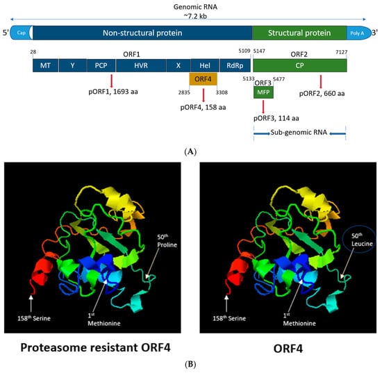 HEV is a positive-sense, 5′-capped, single-stranded RNA virus of approximately 7.2 kb in length (Figure 1A) [15,16,17]. HEV encodes three open reading frames (ORFs) (ORF1, ORF2 and ORF3) seen in all genotypes [18]. HEV gt1 ORF4 has recently been identified as a novel reading frame embedded entirely within ORF1 in a different reading frame. Transiently expressing ORF4 produces a 20 kDa molecular weight protein detectable by Western blotting of cellular lysates [19,20]. The expression of this ORF4 protein is regulated via an internal ribosome entry site (IRES)-like RNA element that is upregulated via cellular endoplasmic reticulum (ER) stress. ORF4 protein is rapidly turned over within cells as it possesses a proteasomal degradation signal [19]. However, loss of the ubiquitination site within a predicted intrinsically disordered region of the ORF4 protein (alteration of 50th leucine to proline) (Figure 1B) observed in seven sequences isolated from fulminant hepatic failure (FHF) and acute hepatitis patients suggests that viruses producing proteasome-resistant ORF4 may be a contributing factor to negative patient outcomes [19]. ORF4 is known to enhance the replication of gt1 HEV in Huh7 cells by increasing the activity of viral RNA-dependent RNA polymerase (RdRp), located at the terminal 3′ end of ORF1 in response to ER stress [19]. Contrary to this, HEV gt2 to gt4 are not thought to encode ORF4 [19].