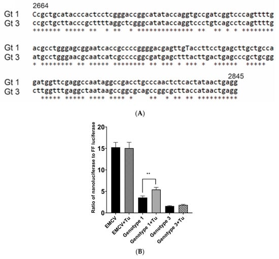An IRES-like RNA element is present in gt1 HEV from 2701 to 2787 bases (Sar55; GenBank accession number AF444002) [19,41]. Sequence alignment of the gt1 HEV IRES region with the homologous gt3 HEV sequence revealed some sequence conservation with only 24.13% (21/87) nucleotide differences within the IRES-like element (Figure 2A). To confirm the presence of the ORF4 IRES-like element in gt1 HEV and to empirically determine whether homologous gt3 HEV sequence could function as an IRES-like element, the IRES-like element sequences were inserted into a dual luciferase expression vector between sequences encoding firefly luciferase (FFL) and nano luciferase (NL). These dual luciferase IRES-like element vectors were then transiently transduced into Huh7 S10-3 cells and then treated with tunicamycin to induce ER stress. An increase in the NL ratio to FFL suggests the activation of the IRES-like RNA element which is known to upregulate ORF4 synthesis in gt1 HEV. Significant differences were observed between untreated gt1 and tunicamycin-treated gt1HEV for the relative ratio of NL to FFL in the presence of tunicamycin (p < 0.01) (Figure 2B). In addition, the initiator amino acid methionine for ORF4 is only present in gt1 HEV (Figure 2C). However, there are methionines in the downstream sequence in gt3 HEV (data not shown) but because gt3 HEV does not retain IRES-like element functionality, it does not possess the coding capacity to generate ORF4.