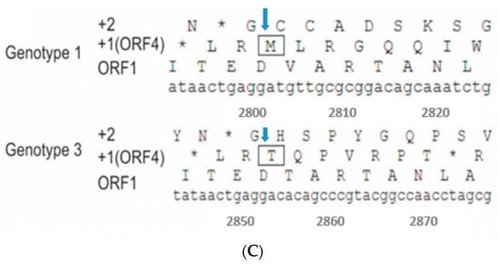 Hepatitis E virus (HEV) is one of the most common causes of acute viral hepatitis and a major causative agent of acute fulminant hepatitis worldwide, with more than 20 million infections per year. HEV is responsible for chronic hepatitis in immunosuppressed patients but can also exhibit extrahepatic manifestations, such as neurological syndromes, renal injury, and hematological disorders [1,2,3]. Orthohepevirus A and C species of the Hepeviridae family are known to cause hepatitis E disease in humans [4,5]. HEV genotype 1 (gt1) and genotype 2 (gt2) are obligate to humans and mainly transmitted enterically, by drinking contaminated water, causing acute hepatitis in low-income and middle-income countries [6]. Zoonotic HEV genotypes 3 (gt3), 4 (gt4), and 7 (gt7) have been detected in both animals and humans, with pigs being the main reservoir for HEV gt3 and gt4 and camels for HEV gt7. The virus is transmitted by eating raw or undercooked infected meat, causing acute and chronic hepatitis [7,8,9,10,11]. Although typically self-limiting with a 2% mortality rate, the virus is highly detrimental to pregnant women during the third trimester, leading to a 30% mortality rate [12]. Ribavirin and IFN-α (PEGIFN-α) are contraindicated in pregnant women, thus limiting the therapeutic measures against HEV infection [13,14].