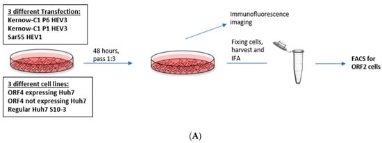 After 5 and 7 dpt, transfected cells were trypsinized using 0.25% trypsin and pelleted at 600× g for 5 min. Cells were then resuspended in 1 mL of 100% methanol and left at 4 °C for a minimum of 15 min. After an overnight storage at −80 °C, cells were spun out of methanol at 1500 rpm for 5 min, washed and resuspended in PBS. Cells were again pelleted, PBS removed and blocked-in blocking solution (10% Odyssey blocking buffer, 5% non-fat dried milk, 0.1% Triton X-100 in PBS) in 96-well plate for 30 min at 37 °C [44]. Cells were then washed with PBS once before probing with primary antibody—rabbit anti truncated ORF2 HEV diluted 1:200 in blocking solution for 30 min at 37 °C. After washing twice in PBS, cells were incubated with secondary antibody—goat anti-rabbit-phycoerythrin (PE) (Life Technologies) diluted to 1:400 PBS for 30 min at 37 °C. Cells were then washed twice in PBS, resuspended in 200 µL of PBS. Fluorescence was analyzed for 20,000 events using a flow cytometer (BD Accuri C6 Plus, Biosciences, San Diego, CA, USA). Gates were set to exclude dead cells based on forward and side scatter profiles and mock infected cells were used to gate background fluorescence. Similar protocol was performed for infected HepG2/C3A cells for the quantification of ORF2-positive cells after 5 dpt.