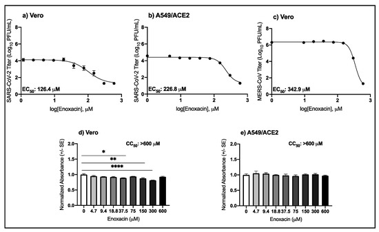 Antiviral activity of enoxacin against SARS-CoV-2 and MERS-CoV in cell culture. Mean SARS-CoV-2 titers (±SE) in (a) Vero and (b) A549/ACE2 cells. Mean MERS-CoV titers (±SE) in (c) Vero cells. Mean cellular viability in (d) Vero (one-way ANOVA; F (8,18) = 11.2, p = 1.4 × 10−5) and (e) A549/ACE2 cells (one-way ANOVA; F (8,18) = 0.7, p = 0.7). Pairwise t-tests from 0 μM: * p < 0.05, ** p < 0.001, **** p < 0.00001.