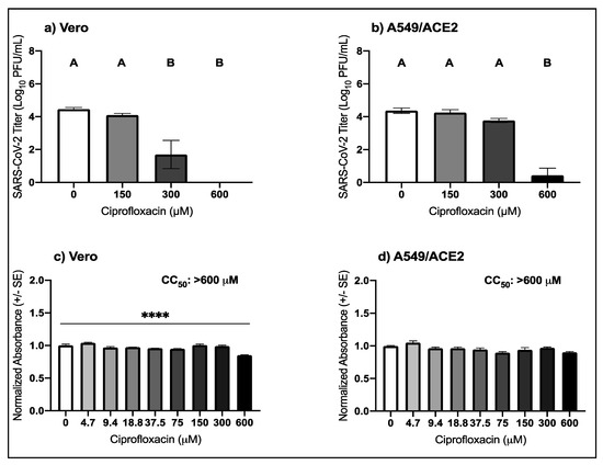 Antiviral activity of ciprofloxacin against SARS-CoV-2 in cell culture. Mean SARS-CoV-2 titers (±SE) in (a) Vero (one-way ANOVA, F (3,8) = 23.1, p = 0.0003) and (b) A549/ACE2 cells (one-way ANOVA, F (3,8) = 53.3, p = 1.3 × 10−5). Mean cellular viability in (c) Vero (one-way ANOVA; F (8,18) = 21.1, p = 1.2 × 10−7) and (d) A549/ACE2 cells (one-way ANOVA; F (8,18) = 5.6, p = 0.001). Values that do not share a letter are significantly different (p < 0.05). Pairwise t-tests from 0 μM: **** p < 0.00001.
