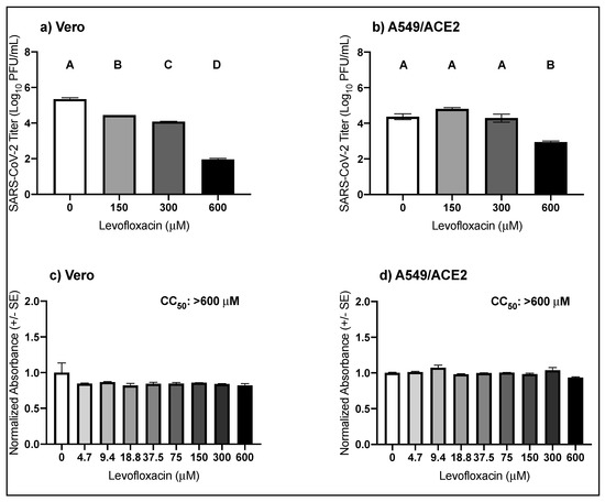 Antiviral activity of levofloxacin against SARS-CoV-2 in cell culture. Mean SARS-CoV-2 titers (+/- SE) in (a) Vero (one-way ANOVA, F (3,8) = 786.0, p = 3.2 × 10−10) and (b) A549/ACE2 cells (one-way ANOVA, F (3,8) = 30.5, p = 9.9 × 10−5). Mean cellular viability in (c) Vero (one-way ANOVA; F (8,18) = 1.3, p = 0.3) and (d) A549/ACE2 cells (one-way ANOVA; F (8,18) = 3.8, p = 0.009). Values that do not share a letter are significantly different (p < 0.05).