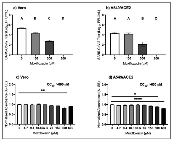 Antiviral activity of moxifloxacin against SARS-CoV-2 in cell culture. Mean SARS-CoV-2 titers (±SE) in (a) Vero (one-way ANOVA, F (3,8) = 377.6, p = 5.9 × 10−9) and (b) A549/ACE2 cells (one-way ANOVA, F (3,8) = 68.6, p = 4.8 × 10−6). Mean cellular viability in (c) Vero (one-way ANOVA; F (8,18) = 8.1, p = 0.0001) and (d) A549/ACE2 cells (one-way ANOVA, F (8,18) = 15.9, p = 1.1 × 10−6). Values that do not share a letter are significantly different (p < 0.05). Pairwise t-tests from 0 μM: * p < 0.05, ** p < 0.001, **** p < 0.00001.