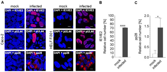 Qualitative and quantitative analysis of HCMV protein expression in Caco-2 cells. (A) Caco-2 cells were uninfected (mock) or infected with HCMV. After 7d p.i. the cells were subjected to immunofluorescence using antibodies against IE1/IE2 (immediate early), pUL44 (early) and pp28 (late). Mock-infected cells served as control. Size standard: 10 μm. As a control we used mock-infected and infected HELF Fi301. Mock-infected and HCMV infected Caco-2 at 7d p.i. were subjected to flow cytometry using antibodies against IE1/IE2 (B) or pp28 (C) in order to quantify percent of infection. Values represent mean ± SD from three independent experiments. **** p < 0.0001, * p < 0.05.