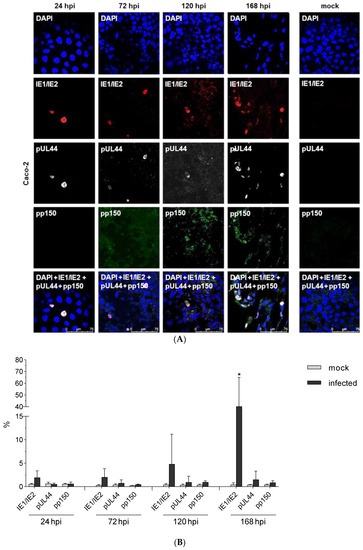 Qualitative and quantitative kinetic analysis of HCMV protein expression during the infectious cycle in Caco-2 cells. (A) Caco-2 cells were infected with HCMV-TB40/E-pp150EGFP (MOI 10) and after 1, 3, 5, and 7 d p.i. subjected to immunofluorescence. Staining was performed by using GFP auto-fluorescence (Green, pp150, Late antigen) and antibodies against IE1/2 (Red, DyLight 549, Immediate early antigen) and pUL44 (White, Alexa Fluor 647, Early antigen). Mock-infected cells (168 hpi) served as control.Scale bar: 75 µm (B) Mock-infected and HCMV infected Caco-2 were after 1, 3 5 and 7d p.i. subjected to flow cytometry using antibodies against IE1/IE2 or pUL44 as well as GFP autofluorescence in order to quantify the percent of infection. Values represent mean ± SD from three independent experiments. * p < 0.05.