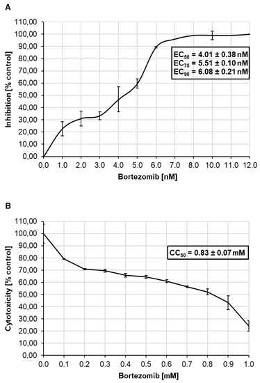 Theeffective concentrations (EC) of Bortezomib against HCMV were for mean EC50 value 4.01 ± 0.38 nM, the mean EC75 value 5.51 ± 0.10 nM and the mean EC90 value 6.08 ± 0.21 nM (Figure 5A).
