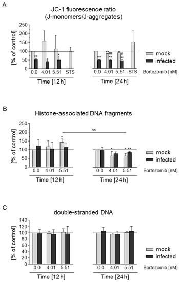 To investigate the influence of HCMV and Bortezomib on very early stages of apoptosis, the JC-1 assay was used (Figure 7A). The ratio of staining of JC-1 dye is dependent on mitochondrial membrane potential and changes indicate activation of the intrinsic pathway of apoptosis resulting in loss of membrane potential. The infection and cultivation of Caco-2 was carried out as described under 2.3. Subsequently, the cells were treated with Bortezomib (4.01 nM [EC50], 5.51 nM [EC75]) for 12 h and 24 h or left untreated. The JC-1 fluorescence ratio (%) of infected and proteasome inhibitor-treated mock-infected and infected Caco-2 was normalized against that of the mock-infected control. At both time points HCMV-infected cells induced a significant decrease in the green/red fluorescence intensity ratio compared to the mock-infected cells (Figure 7A, w/o). Bortezomib showed the same trend in the infected Caco-2, and in addition after 24 h a decrease in mock-infected cells. Moreover, after 12 h treatment of mock-infected cells with Bortezomib an increase was observed (Figure 7A). Interestingly, after 24 h treated mock-infected cells showed a significantly reduced effect. Staurisporin was used as control. These results demonstrated that HCMV infection prevents the depolarisation of the mitochondrial transmembrane regardless of the concentration of Bortezomib.