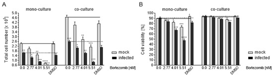 Proliferation and viability effects of Caco 2 mono- and co-cultures. Mock-infected and infected Caco-2 cells were treated with Bortezomib, the solvent DMSO or left untreated. Seven days after treatment, proliferation and viability were analyzed using the trypan blue exclusion assay. (A) Total number of cells (× 105) of untreated, Bortezomib treated and the solvent treated cultures. (B) Cell viability (%). In the graph, the solid line indicates the level of the values of the mock-infected control of the Caco-2 mono- and co-cultures and the dashed line those of the infected cultures. *, ** Infected vs. mock-infected Caco-2 and bortezomib-treated mock-infected and infected Caco-2 vs. appropriately infected Caco-2. Values represent mean ± SD from three independent experiments. * p < 0.05, ** p < 0.01, *** p < 0.001, **** p < 0.0001.
