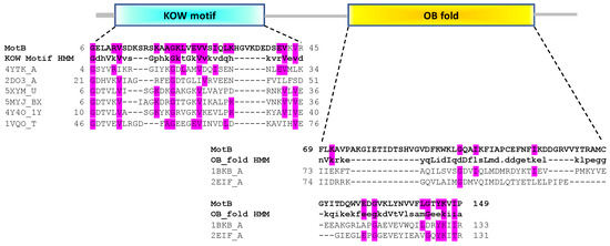 Domain organization of MotB predicts an N-terminal KOW and a C-terminal OB-fold domain. The Pfam Hidden Markov Model (HMM) consensus sequences of the KOW and OB-fold motifs are aligned with MotB residues 6 to 45 and 69 to 149, respectively, along with some other top hits for MotB found by HHsearch/HHpred (Table S3). For the KOW domain, these hits are PDB ID 4YTK, the KOW1-Linker1 domain of Saccharomyces cerevisiae Spt5 transcription elongation factor; 2DO3, the third KOW motif of human Spt5; and 5XYM, 4Y4O, 5MYJ, and 1VQO, ribosomal proteins of the bacteria Mycobacterium smegmatis, Thermus thermophilus and Lactococcus lactis and the archaean Haloarcula marismortui, respectively. For the OB-fold domain, these are 1BKB and 2EIF, the translation initiation factors 5A of the archaea Pyrobaculum aerophilum and Methanocaldococcus jannaschii, respectively. In each case identical residues within MotB and the consensus and/or MotB and the hits are highlighted in magenta. The alignment for the C-terminal portion of the third KOW motif of human Spt5 has been previously reported [41]. More information about the top 10 hits is given in Table S3.