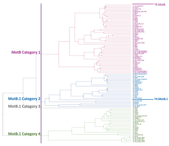 The sequence alignments were then used to calculate distance and generate a UPGMA tree. The tree shows that the MotB group (Category 1, colored in magenta) represents a distinct branch from the branches containing the MotB.1 group (Categories 2-4 colored in blue, grey, and green, respectively) (Figure 2). There was no clear correlation between the particular tree branch and the specific phage genera (Table S4). In a previous classification of Myoviridae subfamilies, MotB along with the T4 Pin and T4 ModA proteins was used to subdivide the Teequatrovirinae (i.e., Tevenvirinae) subfamily into ”T4-like” and the ”KVP40-like” groups [43]. Using this classification, all of the homologs were within the ”T4-like” phage group.