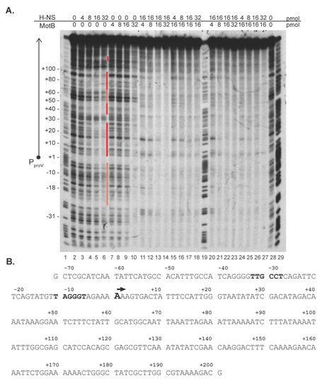 Representative DNase I footprint of MotB and/or H-NS at PproV and the PproV sequence. (A) DNA surrounding the PproV promoter (positions −71 to +201; 0.05 pmol DNA; 13.6 pmol total bp; 5’-32P labeled on the nontemplate strand) was incubated with the indicated amount of MotB-His and/or H-NS and treated with DNase I before electrophoresis on a 5% (w/v) polyacrylamide, 7 M urea denaturing gel. A schematic of the PproV promoter region is shown to the left of the gel, and the positions corresponding to the DNA sequence determined from the G + A ladder are indicated. Regions protected or partially protected by H-NS are indicated by the dark and light red bars, respectively, to the right of lane 6. Lanes 1, 19, 29: G + A ladder; lane 2, 28: no protein control; lanes 3–6: 4 pmol, 8 pmol, 16 pmol, and 32 pmol H-NS, respectively; lanes 7–10: 4 pmol, 8 pmol, 16 pmol, and 32 pmol MotB, respectively; lanes 11–14 and 20–23: 16 pmol H-NS with 4 pmol, 8 pmol, 16 pmol, and 32 pmol MotB, respectively; lanes 15–18 and lanes 24–27: 16 pmol of MotB with 4 pmol, 8 pmol, 16 pmol, and 32 pmol H-NS, respectively. For lanes 11–18, H-NS and MotB were added together; for lanes 20–27, the protein whose concentration did not change was added first and incubated with the DNA for 10 min at 37o C before the addition of the second protein. (B) Nontemplate sequence of the PproV promoter (−71 to +201). The +1 TSS is indicated by the black arrow and the +1 TSS and the −35 and −10 elements are in bold.