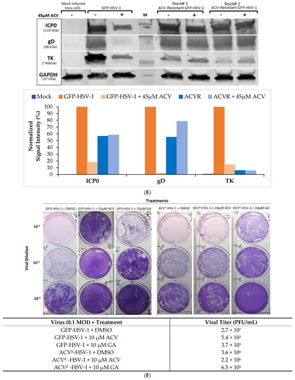 Verification of acyclovir-resistant (ACVR) HSV-1 infection in Vero cells. (A) Flow chart of the methodology used to create ACV-resistant (ACVR) mutants, adapted from Sarisky et al. [33]. Verification of acyclovir-resistant (ACVR)-GFP-HSV-1 17+ in Vero cells. (B) Fluorescent images of 0.1 MOI GFP-HSV-1 infection in Vero cells with or without 45 µM ACV. FITC filter with excitation of 490 nm and emission of 525 nm was used to visualize viral plaques at 40× magnification; Scale bar represents 200 µm. (C) Fluorescent images of 0.1 MOI ACVR-GFP-HSV-1 infection in Vero cells with or without 45 µM ACV. FITC filter with excitation of 490 nm and emission of 525 nm was used to visualize viral plaques at 40× magnification. Scale bar represents 200 µm. (D) Plaque Assays of viral stocks (1 MOI) with or without 45 µM ACV in Vero cells in viral dilutions of 10−2 to 10−4, shown as qualitative image and in a table with averaged viral titers. (E) Western Blot analysis using antibodies directed against HSV-1 infected cellular protein 0 (ICP0; Santa-Cruz, sc-53070), glycoprotein D (gD; Santa-Cruz, sc-69802), thymidine kinase (TK; Invitrogen, PA5-67984), and GAPDH (0411; Santa-Cruz, sc-47724). M: Chameleon 800 Pre-stained Protein Ladder (Li-Cor, 928-80000). Signaling intensities of bands for each antibody have been normalized (as a percentage) to GFP-HSV-1. ACVR: ACVR-HSV-1. (F) Plaque Assays of GFP-HSV-1 17+ (0.1 MOI) and ACVR- HSV-1 (0.1 MOI) with various treatments in Vero cells such as DMSO (1:2000), 10 µM GA, and 10 µM ACV in viral dilutions of 10−2 to 10−4, shown as qualitative image and in a table with averaged viral titers.