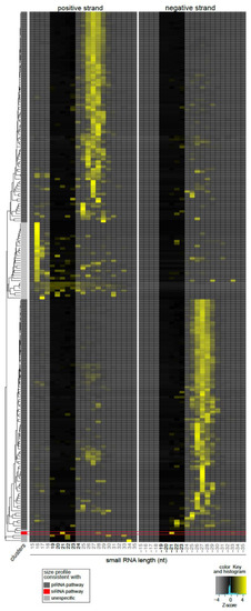 Small RNA size distribution of putative viral sequences assembled from sandfly RNA libraries. Clustering is shown as a heatmap based on Pearson correlation of the sRNA profile. Clusters are defined by a Pearson correlation above 0.8. Viral contigs were classified according to the small RNA size distribution expected for siRNA and piRNA populations in insects. Shaded columns represent small RNAs with length between 19 and 23 nt.