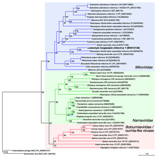 Phylogenetic analysis. Phylogenetic tree inferred by maximum likelihood using full-length amino acid sequences of the RNA-dependent RNA polymerase (RdRp). Phylogenetic reconstruction was performed with IQ-TREE using the evolutionary model Blosum62 + F + R6 and 1000 bootstrap pseudoreplicates. The tree was rooted using two sequences of ssRNA bacteriophages belonging to Leviviridae family. Colored clades correspond to the familis Mitoviridae (blue) and Narnaviridae (green), and to Botourmiaviridae/ourmia-like viruses (red).