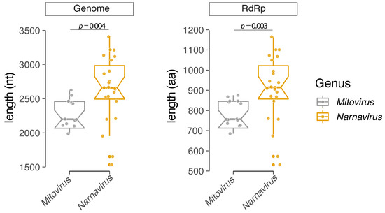 Comparative genome length. Comparison of genome and RNA-dependent RNA polymerase (RdRp) lengths of viruses of the genera Narnavirus and Mitovirus.