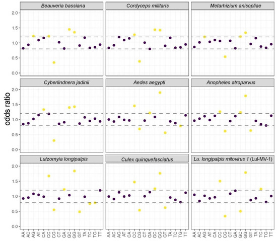 Dinucleotide frequency of Lul-MV-1 and nuclear genomes of fungi that commonly infect insects. Yellow circles represent dinucleotide odds ratios which are highly biased regarding the expected frequencies. Purple circles refer to dinucleotide odds ratios within the unbiased region (delimited by dashed lines). Dashed lines indicate cutoffs values of 0.78–1.25.