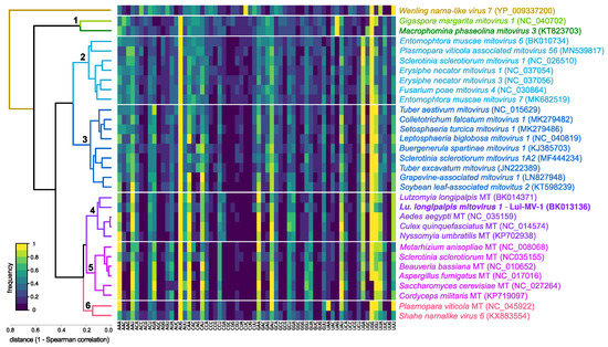 Since di- and trinucleotides patterns can shape codon usage frequency in viruses [80], we also compared the codon usage profile of Lul-MV-1 with the profiles of some mitoviruses and mitochondrial genomes of fungi and insects, which in turn are the known or putative hosts of some viruses. Using a hierarchical clustering of these codon usage profiles, organisms presenting Pearson correlation values of at least 0.8 were grouped into the same clusters. From the six observed groups, clusters 1–3 are exclusively composed of mitoviruses infecting fungal hosts (Figure 5). Clusters 4 and 5 are composed of mitochondrial genomes of insects and fungi, respectively, with exception of Lul-MV-1, which is present in cluster 4, closely related to the mitochondrial genome of Lu. longipalpis. This result suggests that Lul-MV-1 is highly adapted to the mitochondrial codon usage of its putative host. The Shahe narna-like virus 6 [15], characterized from a metagenomic dataset of crustaceans, showed a codon usage frequency closely related to the mitochondrial genome of the fungus Plasmopara viticola. Nevertheless, the Plasmopara viticola associated mitovirus 56 presented a profile distantly related to its host, but closely related to other fungal mitoviruses. Finally, the Wenling narna-like virus 7, another virus detected in a metagenomic sample derived from crustaceans [15], showed a codon usage frequency unrelated to any of the tested organisms.