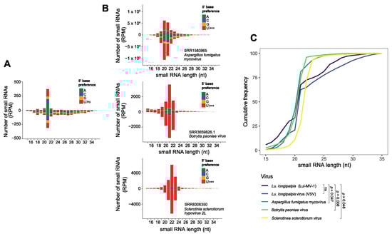 Characterization of small RNAs derived from Lu. longipalpis and fungi-related viruses. (A) Small RNA size profiles and 5′ base preference of small RNAs derived from Lul-MV-1 and (B) fungi-related viruses (from top to bottom: Aspergillus fumigatus mycovirus, Botrytis paeoniae virus and Sclerotinia sclerotiorum hypovirus). 5′ base preferences of small RNAs are indicated by color. Significant differences are also indicated. (C) Cumulative frequency according to the size distribution of small RNAs varying from 15 and 35 nt, derived from viruses infecting Lutzomyia (Lul-MV-1 and VSV) and fungi. Statistical significance among cumulative frequencies was determined using the Kolmogorov-Smirnov test.
