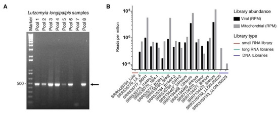 To confirm the presence of the virus found in Lu. longipalpis, we used eight pools containing 10 sandflies per pool, collected from a colony originally started from individuals collected in Teresina, Brazil, and maintained at the Laboratory of Physiology of Hematophagous Insects (Department of Parasitology, Instituto de Ciências Biológicas, Universidade Federal de Minas Gerais). Total RNA was extracted from pools of 5 insects each using Trizol reagent according to the manufacturer’s protocol (Invitrogen—Thermo Fisher Scientific Inc., Waltham, MA, USA). Total RNA (1 μg) was reverse transcribed using 250 ng of random primers specific primers per reaction. The resulting cDNA was used as template for PCR reaction containing primers designed to amplify a product of 509 bp. Primer sequences are listed in Table S4. Conventional PCR was performed using 1.5 μL of each designed primer (10 pmol/μL), 200 ng of cDNA or DNA and Taq DNA polymerase (Invitrogen, Thermo Fisher Scientific Inc.). PCR products were cleaned up with EDTA 125 mM precipitation protocol and sequenced using Sanger technology.