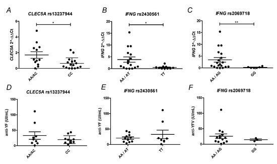 3.3. Polymorphism in CLEC5A and IFNG Genes Modulates the Immunologic Response to the YF17DD Vaccine