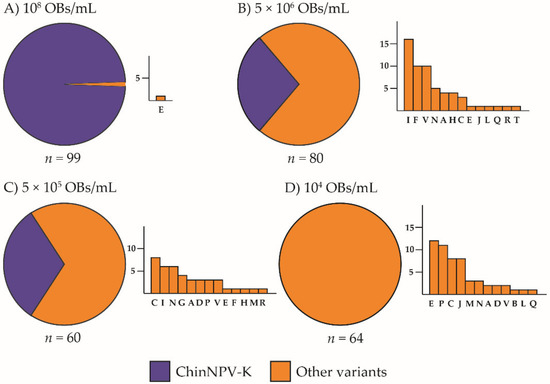 The intermediate concentrations of 5 × 106 and 5 × 105 OBs/mL resulted in 76% and 40% mortality, respectively. These concentrations also resulted in intermediate prevalences of 32% and 28%, respectively, of the ChinNPV-K REN profile in OBs from virus-killed insects. At a concentration of 5 × 106 OBs/mL, ChinNPV-I was the most prevalent variant followed by twelve other variants (Figure 1B). At 5 × 105 OBs/mL, ChinNPV-C was the most prevalent of the minority variants (Figure 1C). The lowest inoculum concentration, 104 OBs/mL, resulted in 14% mortality, but none of the virus-killed larvae produced a ChinNPV-K REN profile, whereas the ChinNPV E variant was the most prevalent REN profile, followed by eleven other variants (Figure 1D).