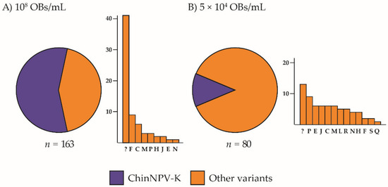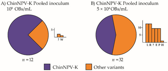 The OB samples collected following the inoculation of larvae with ChinNPV-K at the lower concentration (5 × 104 OBs/mL) were pooled and used to inoculate new batches of larvae at two inoculum concentrations to determine whether the ChinNPV-K variant could be recovered by a single passage of pooled OB samples. The REN profile of the pooled OB sample was identical to that of the ChinNPV-K variant profile. When pooled OBs were used to inoculate larvae at the higher concentration (1 × 108 OBs/mL), 9 out of 12 virus-killed larvae (75%) presented the ChinNPV-K variant profile, whereas the remaining 3 larvae (25%) presented two different variant profiles (Figure 5A). When pooled OBs were used to inoculate larvae at the lower concentration (5 × 104 OBs/mL), the ChinNPV-K variant was again the most prevalent profile present in 14 out of 32 larvae (44%) of the total recovered genotypes. The remaining 18 insects (56%) presented one of six different variant profiles in different frequencies (Figure 5B). These results suggest that: (i) pooling the OBs of multiple variants may result in a variant K-type consensus REN profile and (ii) that the pooled OBs behaved similarly to pure ChinNPV-K variant inoculum in that the ChinNPV-K variant profile predominated in most larvae that died from high concentration pooled inoculum, whereas considerable diversity was observed in larvae that died from low concentration pooled inoculum.