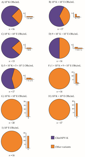 Concentrations of ChinNPV-K and ChinNPV-E in inoculum mixtures with a total concentration of 5 × 104 OBs/mL.