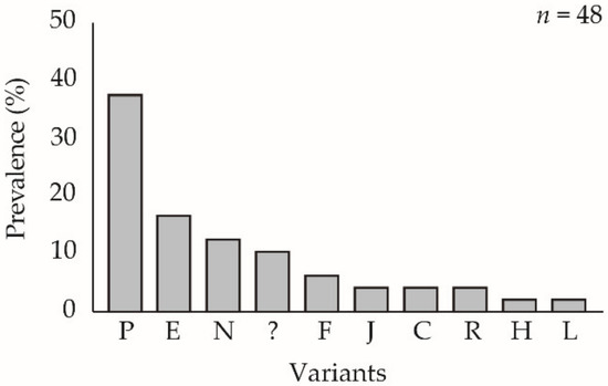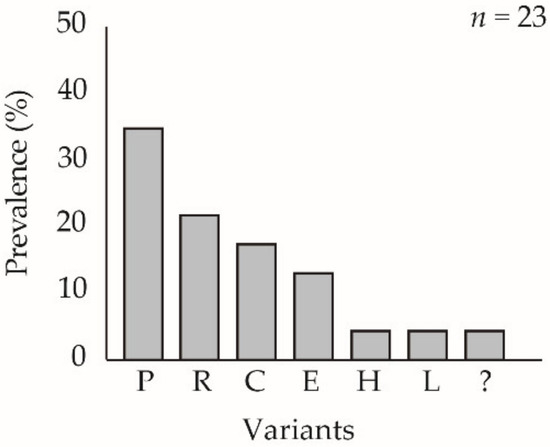 Inoculation of ChinNPV-K and ChinNPV-E pure variant OBs in C. includens fifth instars resulted in marked differences in the frequency of variants in virus-killed insects. Inoculum concentration significantly affected the prevalence of larvae showing the ChinNPV-K REN profile (χ2 = 41.84, df = 1, p < 0.001). The higher inoculum concentration of 108 OBs/mL ChinNPV-K resulted in 99% mortality, but only 57% of larvae (90 out of 157 virus-killed insects) inoculated with the ChinNPV-K inoculum showed the ChinNPV-K variant REN profile (Figure 2A). The remaining 43% of insects showed one of nine different variants, the most prevalent of which was a previously unknown variant, present in 26% (41 out of 157 larvae) of virus-killed insects. The unknown variant (shown as “?” in Figure 2) did not match any of the variants identified previously [17]. The 5 × 104 OBs/mL concentration of ChinNPV-K inoculum resulted in 22% mortality, and the prevalence of ChinNPV-K REN profiles in virus-killed insects was 13% (10 out of 79 insects). The remaining 87% of insects showed REN profiles of thirteen different variants, the most prevalent of which was a group of unknown variants present in 16% (13 out of 79 larvae) of virus-killed insects comprising REN profiles that did not match any of the variants identified previously [17].