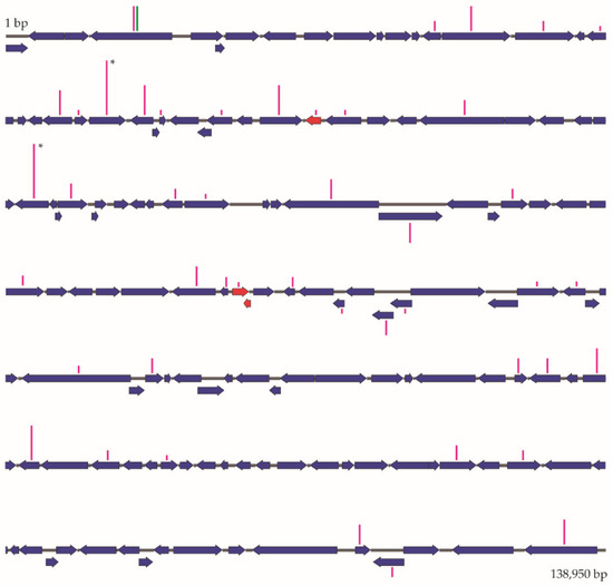 Schematic representation of ChinNPV-K genome ORFs. Vertical bars represent the number of cumulative SNPs in each ORF in pink for ChinNPV-K and green for ChinNPV-E, resulting in different heights according to the number of SNPs. Bars labelled with asterisks indicate the highest number of SNPs detected, which was 22 SNPs per ORF. Only the ChinNPV-K genome is depicted due to the high similarity between the ChinNPV-K and ChinNPV-E ORF length and distribution. The three ORFs in red represent ORFs that are not present in the ChinNPV genomes sequenced previously.