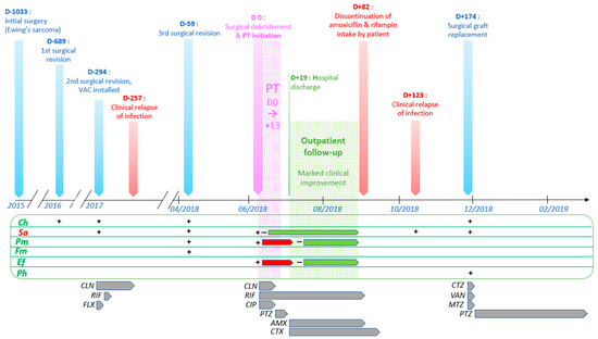 Timeline of the most relevant events, procedures and treatments in the patient’s history, from initial Ewing sarcoma surgical resection to termination of antibiotic therapy after final surgical graft replacement. From top to bottom: vertical arrows represent important events in the clinical progression of the case. Blue vertical arrows represent surgical procedures. VAC: vacuum-assisted closure; PT: phage therapy. Microbiological culture results are displayed in the green horizontal box. Horizontal arrows in this box represent continuations of similar results (red: positive; green: negative) over repeated daily analysis. Ch: Clostridium hathewayi; Sa: Staphylococcus aureus; Pm: Proteus mirabilis; Fm: Finegoldia magna; Ef: Enterococcus faecalis; Ph: Peptoniphilus harei. Lower horizontal arrows represent antibiotic therapies. CLN: clindamycin; RIF: rifampin; FLX: flucloxacillin; CIP: ciprofloxacin; PTZ: piperacillin-tazobactam; AMX: amoxicillin; CTX: ceftriaxone; CTZ: ceftazidime; VAN: vancomycin; MTZ: metronidazole.