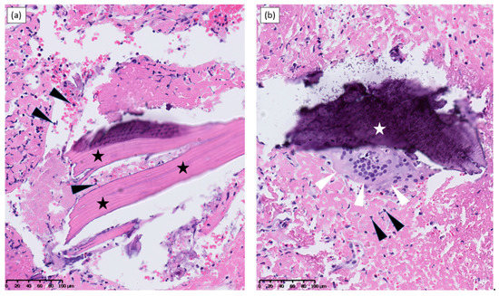 Pathological findings from pelvic bone allograft biopsies obtained upon infection recurrence, six months after phage therapy has been discontinued. (a) Lamellar bone fragments (stars) appear necrotic, displaying only empty osteocyte lacunae; immediate surroundings are infiltrated with inflammation-inducing figurative elements of blood with numerous leucocytes (arrows). (b) Necrotic bone fragment (star) is lysed by a massive osteoclast (white arrows). Immediate surroundings are again infiltrated with numerous leucocytes (black arrows).