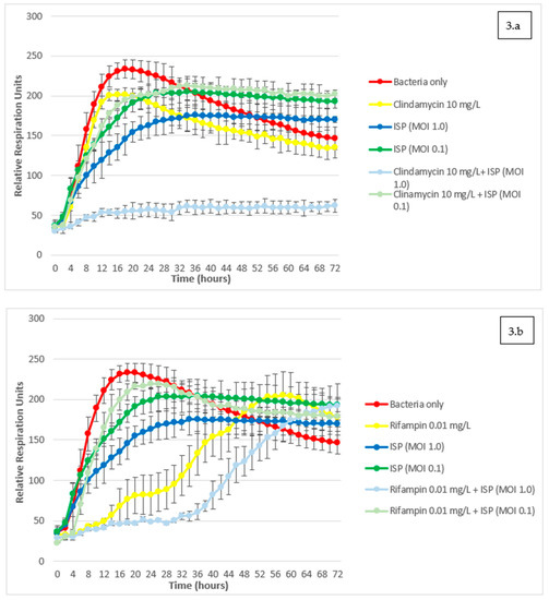 The following are available online at https://www.mdpi.com/article/10.3390/v13101898/s1, Figure S1: Assessment of bacterial growth kinetics with the OmniLog® system. S. aureus strain with phage ISP at different Multiplicities of Infection (MOI). Figure S2: Assessment of bacterial growth kinetics with the OmniLog® system. S. aureus strain with clindamycin at different concentrations. Figure S3: Assessment of bacterial growth kinetics with the OmniLog® system. S. aureus strain with rifampin at different concentrations. Figure S4: Assessment of bacterial growth kinetics with the OmniLog® system. S. aureus strain with ciprofloxacin at different concentrations.,Figure S5: Assessment of bacterial growth kinetics with the OmniLog® system. S. aureus strain with ciprofloxacin at different concentrations and phage ISP at MOI = 1.0. Figure S6: Assessment of bacterial growth kinetics with the OmniLog® system. S. aureus strain with ciprofloxacin at different concentrations and phage ISP at MOI = 0.1.
