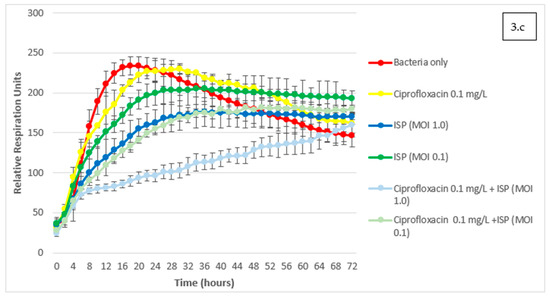 Assessment of phage-antibiotic interactions with the OmniLog® system. Kinetics of bacterial growth under various conditions are expressed as Relative Respiration Units over a 72 h timeframe. Phage ISP at various Multiplicities of Infection (MOI) was combined with different sub-MIC (Minimum Inhibitory Concentration) concentrations of the three antibiotics that were used concomitantly in the patient: (a) clindamycin; (b) rifampin; (c) ciprofloxacin. Results are presented as mean values of three experiments (biological replicates) with error bars representing standard deviations of the means.