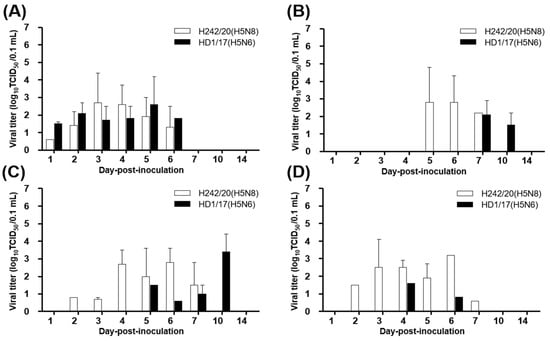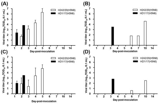 Virus isolation from oropharyngeal (OP) (A,B) and cloacal (CL) (C,D) swab samples of virus-exposed chickens. Five chickens were intranasally inoculated with 106 EID50/0.1 mL H242/20(H5N8) or HD1/17(H5N6) (A,C). For the contact group, three chickens were co-housed with H242/20(H5N8) or HD1/17(H5N6)-infected chickens (B,D). Viral titers are shown as the mean ± standard deviation.