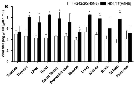 Virus titer of H242/20(H5N8) virus and HD1/17(H5N6) virus in various organs from SPF chickens which were inoculated intranasally with a viral dose of 106 EID50. H242/20(H5N8) and HD1/17(H5N6) virus infected organ tissues were collected at 3 dpi. The virus titers of the organ tissues (10% homogenates) were measured in chicken embryo fibroblast cell (DF-1). Data shown indicate the average of calculable positive organ titer. *; p < 0.05.