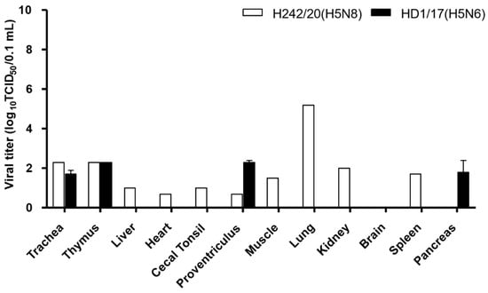 Virus titer of H242/20(H5N8) virus and HD1/17(H5N6) virus in various organs from ducks, which were inoculated intranasally with a viral dose of 106 EID50. H242/20(H5N8) virus and HD1/17(H5N6) virus infected organ tissues were collected at 3 dpi. The virus titers of the organ tissues (10% homogenates) were measured in chicken embryo fibroblast cell (DF-1). Data shown indicate the average of calculable positive organ titer.
