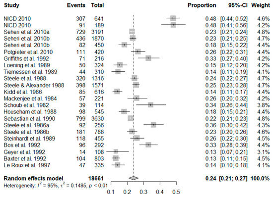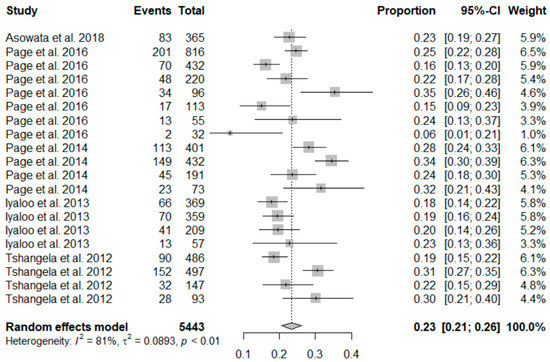 In the 23 studies that were included in the meta-analysis of pre-vaccination, the summary proportion estimated at 24% (95% CI: 21–27%) was obtainable as a random effect due to heterogeneity of estimates across studies. The I2 was 95.19% (95% CI: 95.26–98.66%) of the total variance between studies. Tau I2 was 15% (95% CI: 0.14–0.55%) (SE = 0.0681). The Q test statistic was Q (df = 22) = 457.2123, p-value < 0.0001), and it shows that the included studies did share a common effect size (Figure 2). The presence of publication bias was examined using funnel plots and tests (Egger’s and Begg). A visual inspection of the consequential funnel plot discovered asymmetrical distribution of the study findings. Nevertheless, the impartial assessment of bias using the Egger’s regression test was (z = −0.9253, p = 0.3548), which indicated that there was no evidence of publication bias.