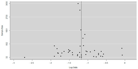 The findings for post-vaccination summary proportion using meta-analysis of random effect was 23% (95% CI: 21–25%). The heterogeneity denoted by obtained I2 was 80.67% (95% CI: 65.02–93.08%) as the total variance between studies, and the settings used in the article that met the inclusion criteria. Additionally, the estimated amount of total heterogeneity represented by Tau I2 was 9% (95% CI: 0.04–0.29%) (SE = 0.0421). The chi-square test statistic, Q (df = 19) = 98.3099, p-value < 0.0001) affirmed that the included studies shared a common effect size. Thus, we concluded that our analysis had substantial homogeneity (Figure 3). However, the Egger’s regression test was conducted, and it showed that there was no evidence of statistically significant publication bias (z = −1.3976, p = 0.1622). The visual assessment of the publication bias revealed an asymmetrical distribution for the overall data that met the inclusion criteria (Figure 4). Additionally, each point in the plot represents a separate study. The vertical axis represents the sample size; the horizontal axis represents the log odds of estimates and the asymmetric of the plot signalizes no publication bias. Finally, the diagnostic test to detect sources of heterogeneity in meta-analytic data (that is Baujat plots) was performed. This plot shows the involvement of each separate study to the overall Q-test statistic for heterogeneity on the horizontal axis against the influence of each separate study. Based on the findings from this study, the plot showed that there was no single study that influenced the results (Figure 5).